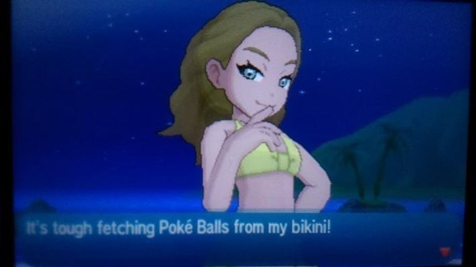 This is the female in the Sun and Moon games where she keeps her Poké Balls inside her bikini, which is in the same spot as her boobs, butt or vagina.