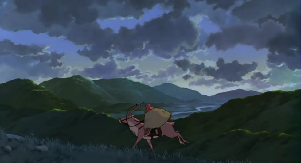 With genius framing and composition and a majestic accompaniment from composer Joe Hisaishi, many scenes from "Princess Mononoke" are absolutely breathtaking. From beautiful landscapes to bustling villages to fiery battlefields, every scene is sure to strike wonder in the viewers' eyes and hearts. Like this frame taken from a scene where protagonist Ashitaka rides to the West in search of a way to lift his curse, director Hayao Miyazaki and cinematographer Atsushi Okui work together to create an electrifying experience like none other.