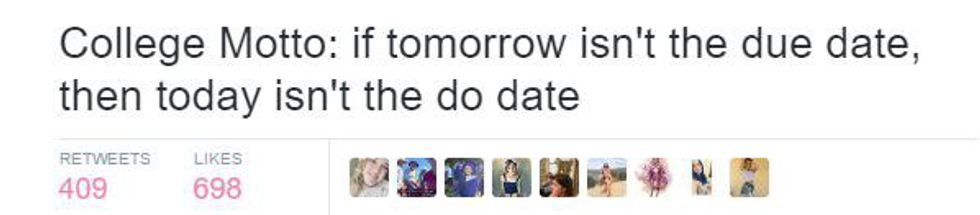 Don't get me wrong, procrastination is not for everyone. I know people that can truly work a little bit on a paper every day, or even complete assignments before the night they are due (a concept I am just not familiar with). Whatever works. Maybe someday, I will try one of these ~alternative~ methods out. But until the time comes that I'm unable to pull together a 10-page paper requiring 15 citations in a single day (yes, I have done that before), you can catch me procrastinating until the last possible moment.