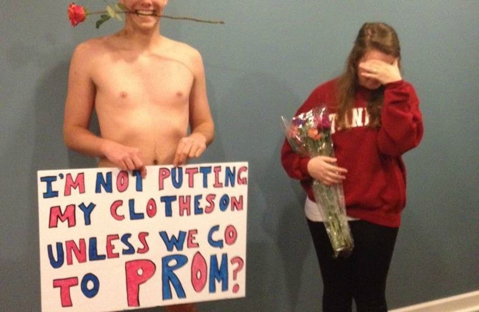 As prom season approaches, every high school girl is dreaming of the special guy who's going to sweep her off of her feet with the most romantic..."promposal." This new phenomenon is sweeping across the U.S. as the use of social media puts more pressure on guys to come up with the most elaborate way to ask a girl to prom. They're out purchasing gifts, making signs, and generally going above and beyond for exactly one night. My personal favorite: a tattoo on a guy's side that wrote: "Prom?" I hope that's temporary, because otherwise "Prom?" will be tattooed on this guy's side forever, an unanswered question. Maybe he should get "yes" or "nah, bro" tattooed underneath, just for some closure. But in all seriousness, what is the point of this?