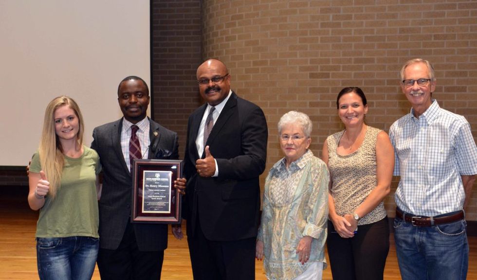 A week later on September 14, we had a few more visitors join our Management 309 class. Mays Business School Dean, Eli Jones, presented Dr. Musoma with the first-ever Mays Business School Spirit Award. Joining and congratulating in the celebration were also Marty Loudder, Associate Dean of Undergraduate Programs; Duane Ireland, Executive Associate Dean; and Wendy Boswell, Head of the Management department. After speechlessly accepting the award, one more special visitor surprised him - his wife.