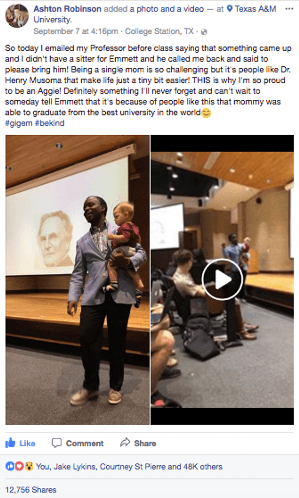 Ashton dutifully plays the roles of both mom and student, a difficult and sometimes impossible task. Typically during class times, a family member or babysitter will watch Emmett, but her babysitter cancelled last minute Tuesday morning. Ashton emailed Dr. Musoma asking if she could schedule an appointment with him to go over what she was going to miss in class based on the circumstances, to which Dr. Musoma responded with, "Call me." He then proceeded to invite her to bring Emmett to class with her not only that afternoon, but any time she was not able to find a sitter. In class he acknowledged the difficulties of being a parent and student, and applauded Ashton's commitment to her education.