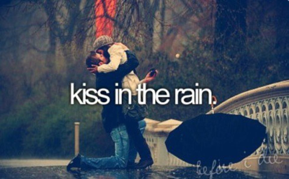 It does not make your relationship stronger by kissing in the rain. No one likes to be wet with clothes on. Save the kissing for inside, easily accessible to a bedroom.