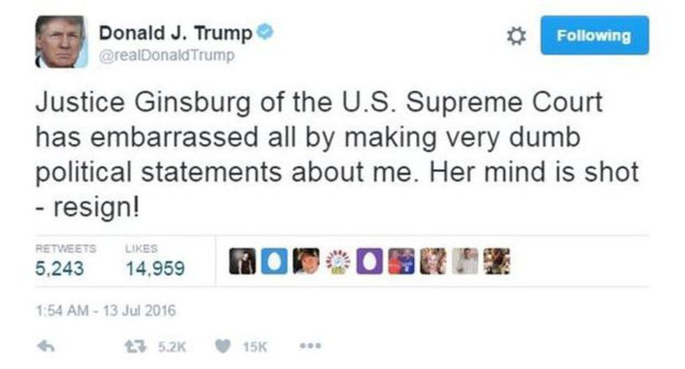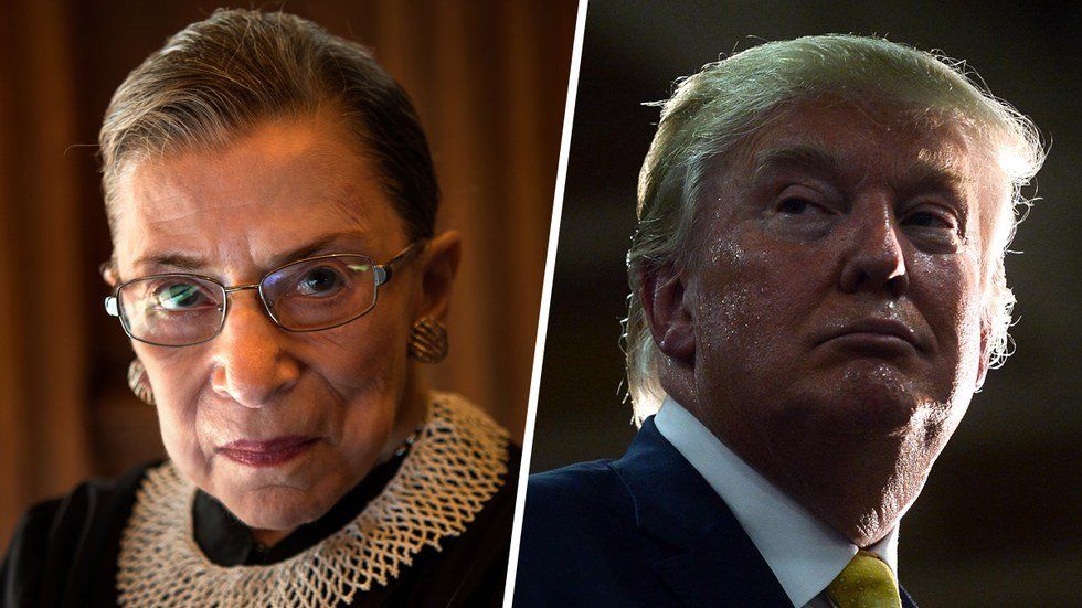 “The Notorious RBG” is a cancer survivor, a women’s rights activist and an extremely intelligent woman. Trump probably didn’t realize that a woman could be so successful without a rich husband or father. Yet seeing that he may be under SCOTUS fire a lot in the near future, it would be in his best interest to lay off now. This isn’t "The Apprentice." you can’t go up to a U.S. Supreme Court Justice and say “You’re Fired.”