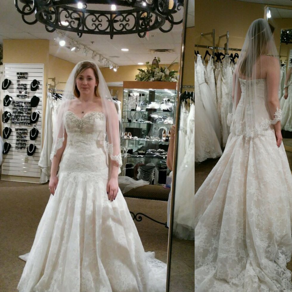 I fell in love. It was lace all over like I wanted. It didn't show parts of my arms that bothered me. There was an elegant train. But the thing that really got me? It made me look like some sort of goddess, giving me a waist I didn't know I had. I loved it.