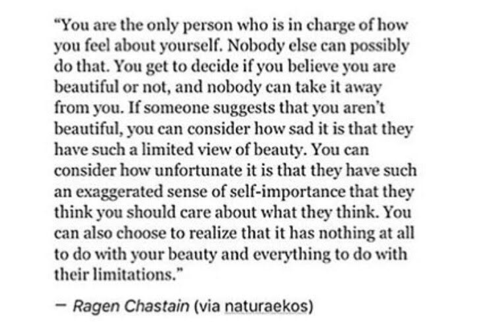 It reminds me that it’s OK if somebody doesn’t find you beautiful if you are already convinced that you, yourself alone, are beautiful. There are too many people in this world that will not like you. And that is okay. There is nothing you can do to change somebody's lack of understanding for who you are. You, yourself alone is what is beautiful and what a waste of time it is to try and convince somebody else that.
