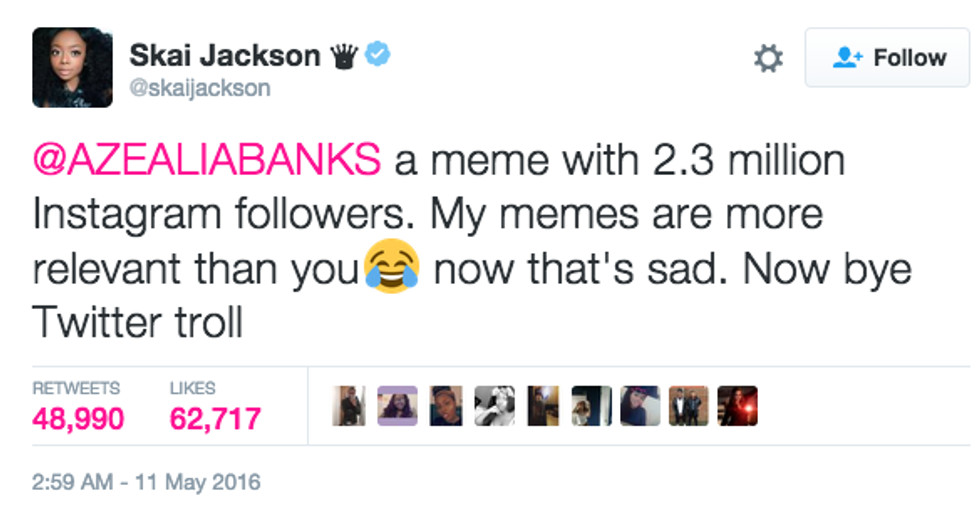 What brought her out of Disney Channel obscurity was when she voluntarily, and unnecessarily, entered a Twitter war with singer Azealia Banks. Granted Banks was going off on a politically incorrect and insensitive Twitter rant at the time, but none of that mentioned or even directly involved Jackson, who put in her two cents by attacking the singer who was ten years her senior. Stating Banks "gave women a bad name", had a "miserable and bitter life", and referred to her as 'Azealia Stanks'. Not to mention the now socially deemed "Iconic" tweet