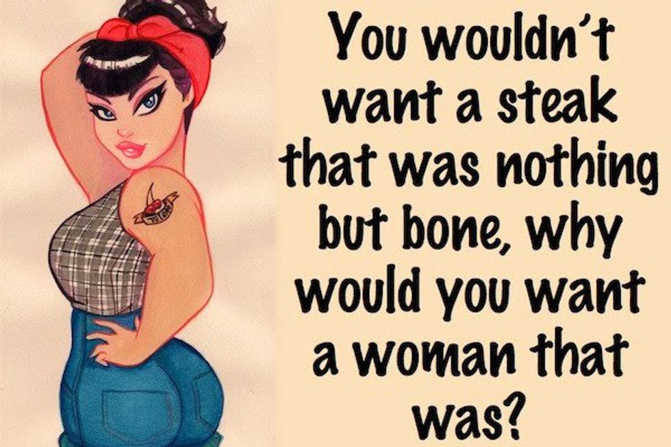 There have also been some popular media quotes promoting the same idea, including "real men like curves, only dogs go for bones." Pictures like this one have also become popular. I hope the person who made this realized that they are comparing all women to a hunk of meat. Enough said.