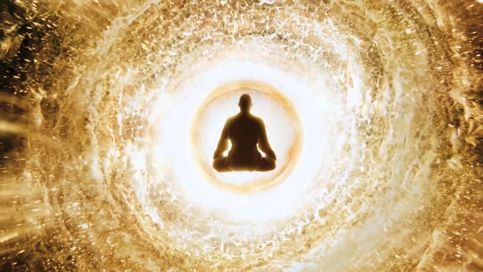 The screen cuts to that same conquistador's face yelling. The acoustics are dampened now, like those of a sound-proof room. His pale head is shaved. A vein on his forehead pulses. He is sitting, floating in a full-lotus position, drifting above an ancient, dying tree. He is calm. He drifts back down into the tree's base through a levitation ability. This tree and its roots visibly maintain an opaque sphere that isn't made of glass. Perhaps it's very thick air? It's not explained and it needn't be. We can deduce that the sphere is traveling relatively fast through outer space where the stars are gold and weep tears of godly dust.