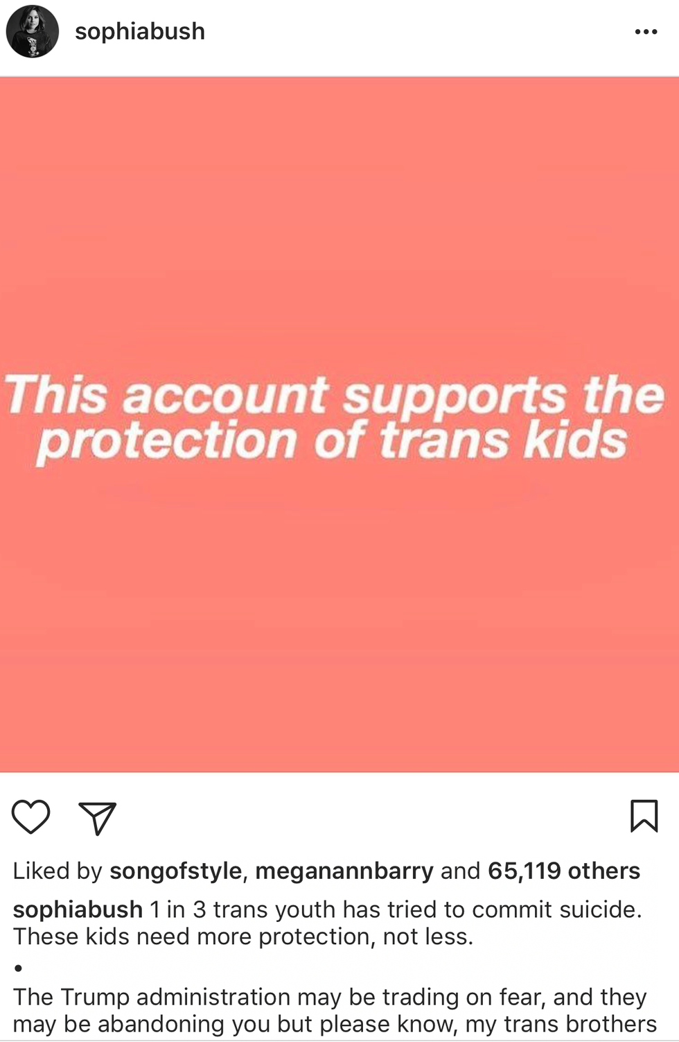 Bush's post does not seem silly or dramatic. It seems like something all accounts should be doing to reassure transgender people that they are loved and accepted and that they should not fear what they will read when they open Twitter, Instagram, Facebook or any other social media app.