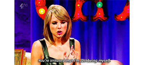 I remember watching an interview where Taylor said "You don't like who I am? Watch me be myself even more", and I thought "YAS GIRL YAS". Taylor knows that there are those groups of people who despise her just because she's herself, but she doesn't care. She wrote the song "Blank Space" as a joke and because she is fully aware that media has labeled her "that girl who only writes songs about ex boyfriends". Talk about great wit.