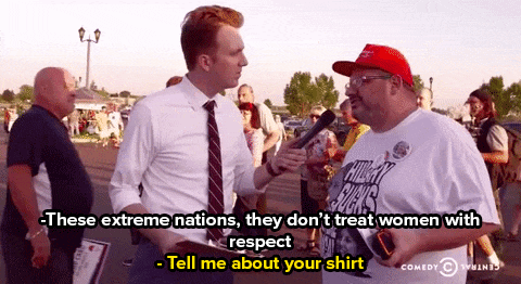 I think the most extreme example of just how much these people don't realize how dumb they are is a man who is asked about how he feels about the treatment of women. He talks about how it is an "American ideal" to treat women with respect and that "extreme nations" go against that ideal. However, he sure has an odd way of reflecting this "American ideal" of respect for women through the shirt he is wearing.