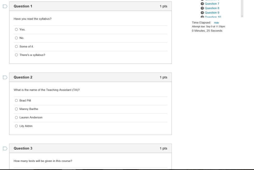 The only thing worse than having a professor who teaches on syllabus day is having a professor who makes you take a quiz on the syllabus. Even if I take the quiz, I bet you I'm still not going to acknowledge the existence of the syllabus ever again.