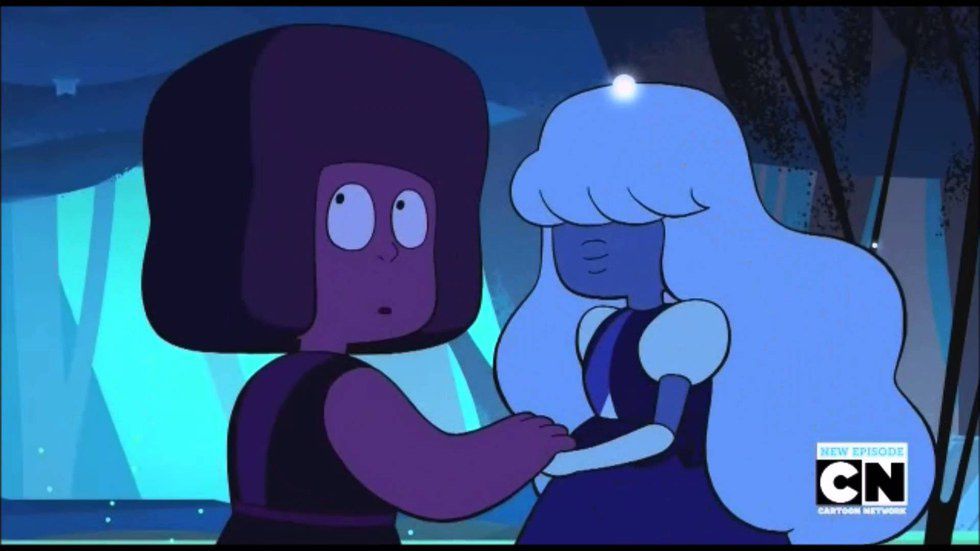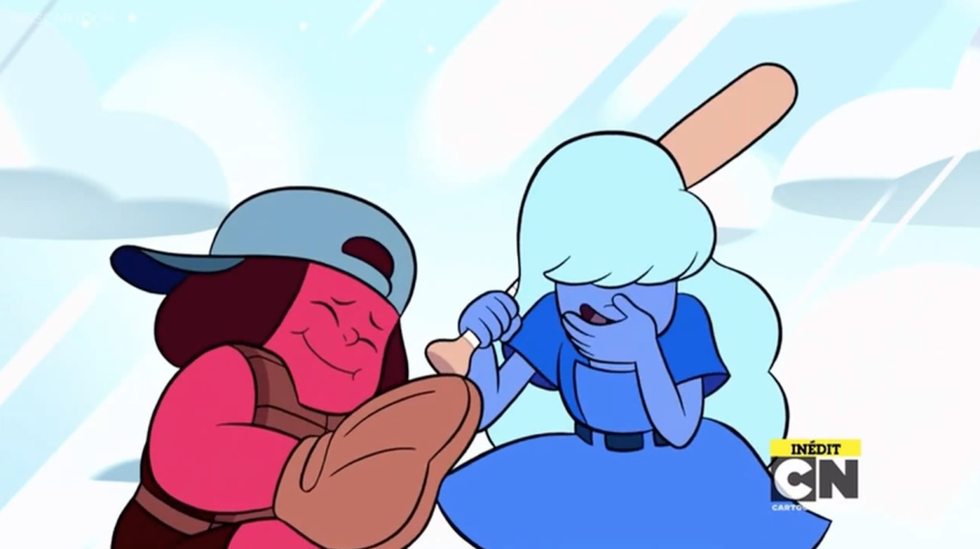 In this episode, we see the reappearance of unfused Ruby and Sapphire. For those unfamiliar with the show, the alien "gems" (like Ruby and Sapphire) can fuse to create a stronger, more powerful gem (in their case, Garnet). For most of the show, Garnet stays fused. There have only been a few instances where we've seen Ruby and Sapphire unfused with each other, and it's strongly implied that the two are in a romantic relationship.