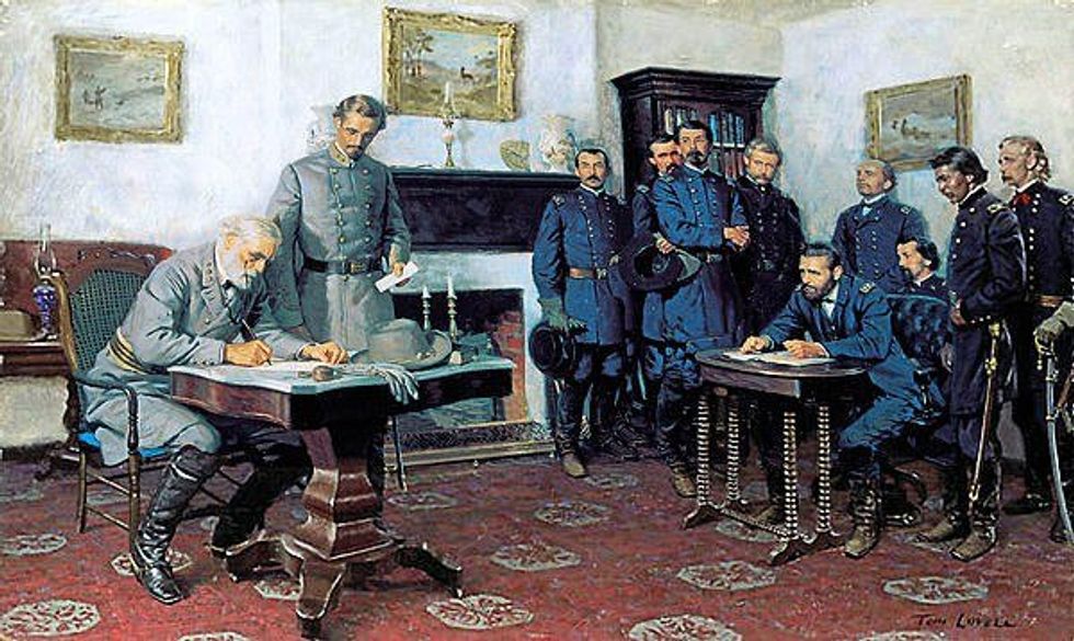 On April 9, 1865, Robert E. Lee and the Army of Northern Virginia surrendered to Ulysses S. Grant and the Army of Potomac at the McLean House in Appomattox Courthouse, Virginia.
