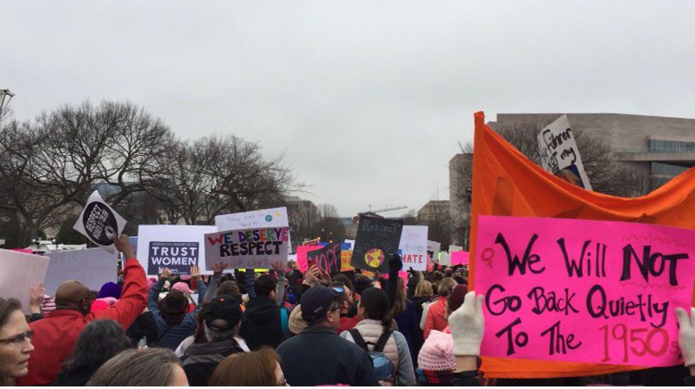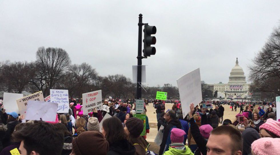 I marched alongside people I had never met before; all of us walking the same path that advocates and civil rights leaders have walked in the past. I walked past the Capitol Building, The Washington Monument, and the White House, feeling the symbolic irony of being able to see so many of America's beloved government buildings as I walked in protest against a government that is ignoring a majority of its people's concerns. Our voices rang out across the city as we chanted, "This is what a Democracy looks like," and "We are here to stay, welcome to your first day." There was passion and hope like there's never been before.