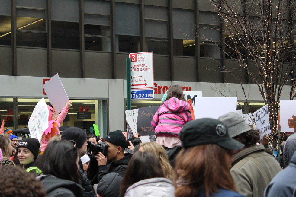When we arrived, I watched two younger girls on the sidewalk changing signs and posing for pictures. Their signs weren't anti-Trump, they said things like "GIRL POWER" and "RAISE BOYS AND GIRLS THE SAME WAY". They too, were worried about their future.