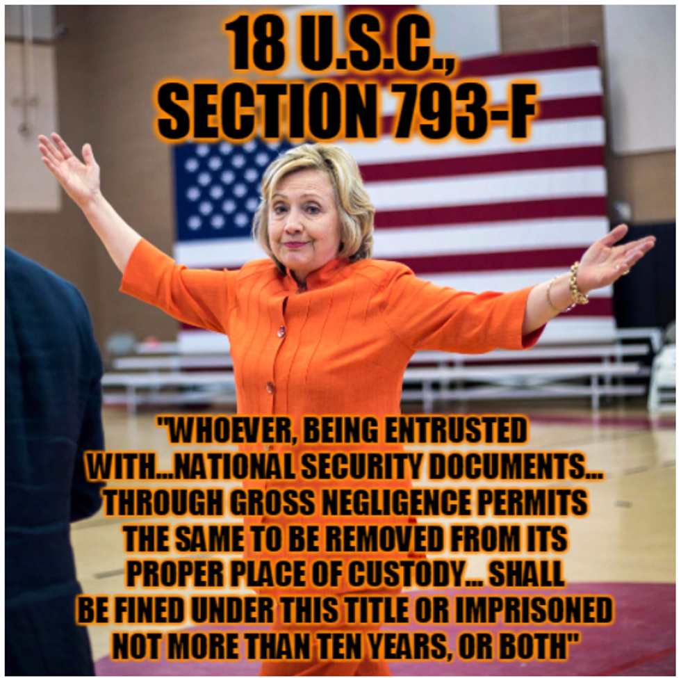 In the United States Criminal Justice System, guilt must be proven beyond a reasonable doubt in a courtroom. The same is true in Federal Court. Throughout this election, and certainly those who have followed the FBI investigated into Hillary Clinton's email, have referred to many different statutes, but specifically 18 US Code Statute 793. In case you're not aware of this statute, it's US Federal Law regarding the Gathering, Transmitting, or Loss of Defense Information, which includes seven (7) sections, and more than 1500 words, but most people refer to Section 793-F, as shown in the meme below:
