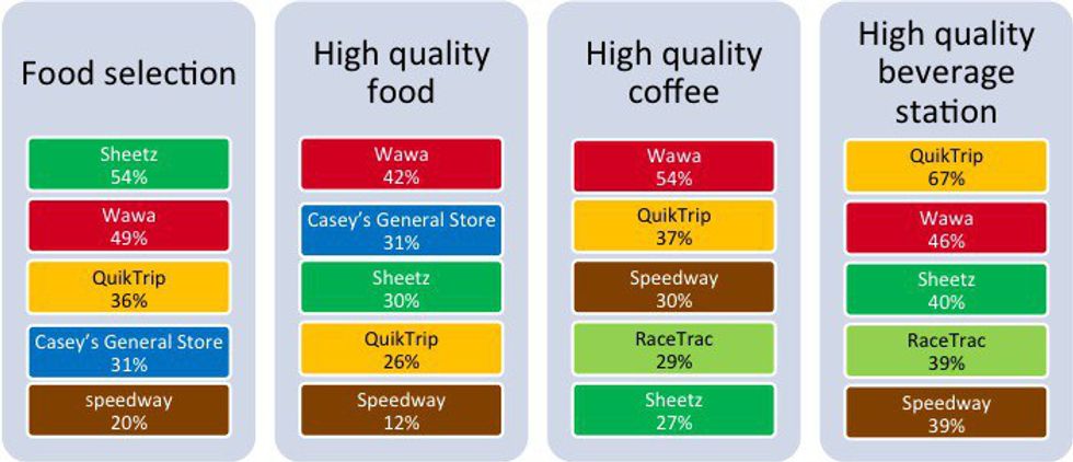 As the below chart shows, Wawa is listed above Sheetz in three of the four categories. Sheetz may have more of a selection for food, howver, Wawa has a higher quality of food (which I agree with because I eat it almost every day).