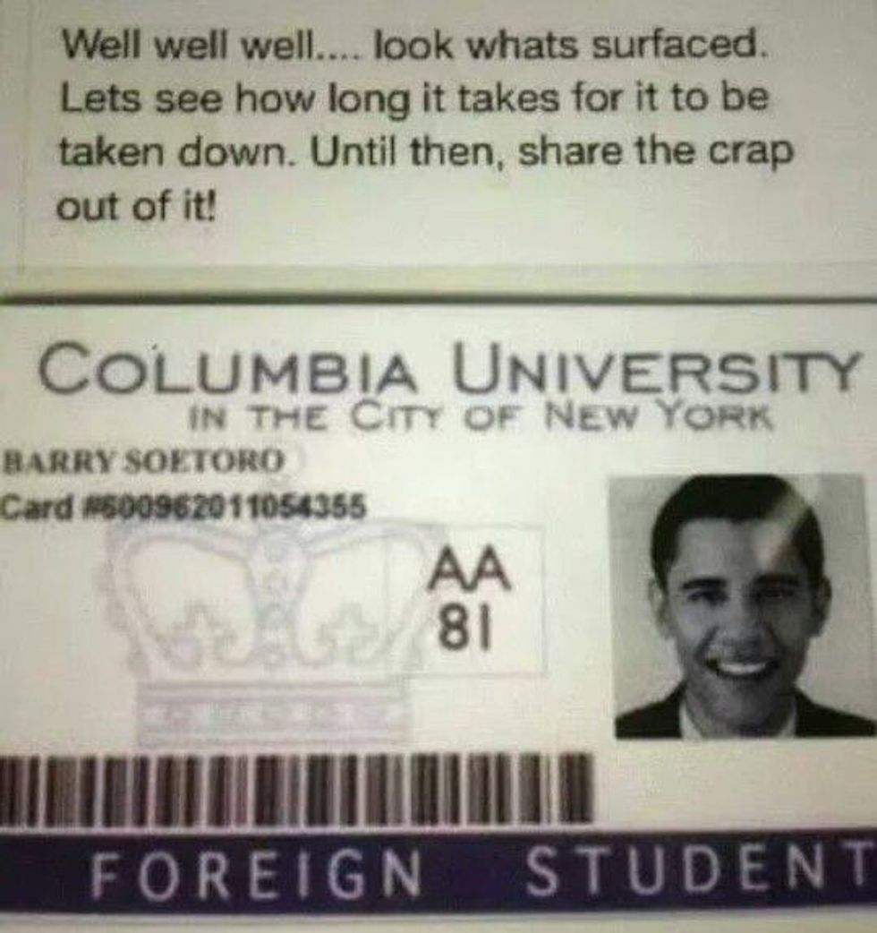 An edited photo of a Columbia University ID card depicts U.S. President Barack Obama attending the school as a foreign student under the name Barry Soetoro. The photo was proved false by Snopes.