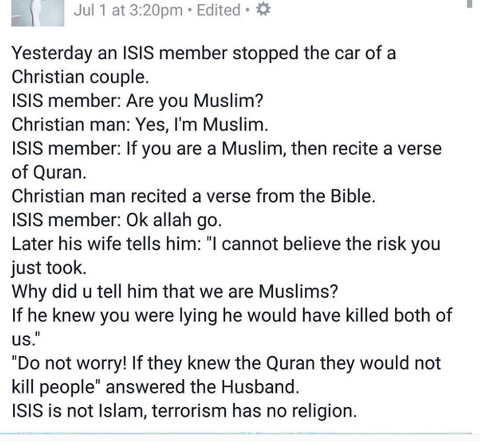 That last line, though! Really, think about it. What religion is based in terror and fear like that? What religion tells its people to go out and destroy others? Not Islam. Not any religion. So why, oh why, do we discriminate against Muslims as if every one of them was behind 9/11 or the Paris attacks? Why can't we just understand that some very bad people shouldn't ruin our view of everyone else?