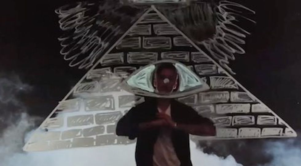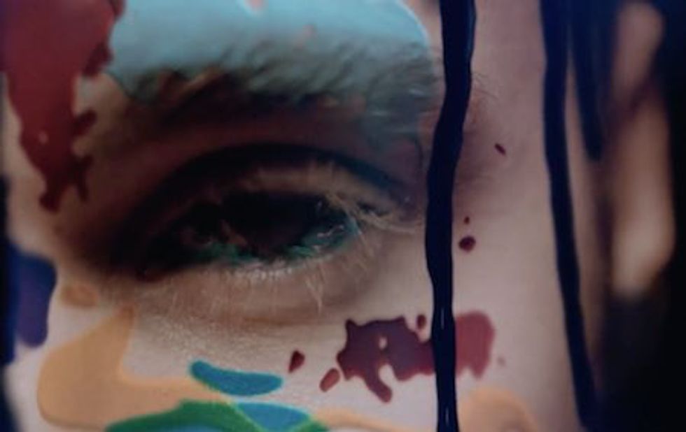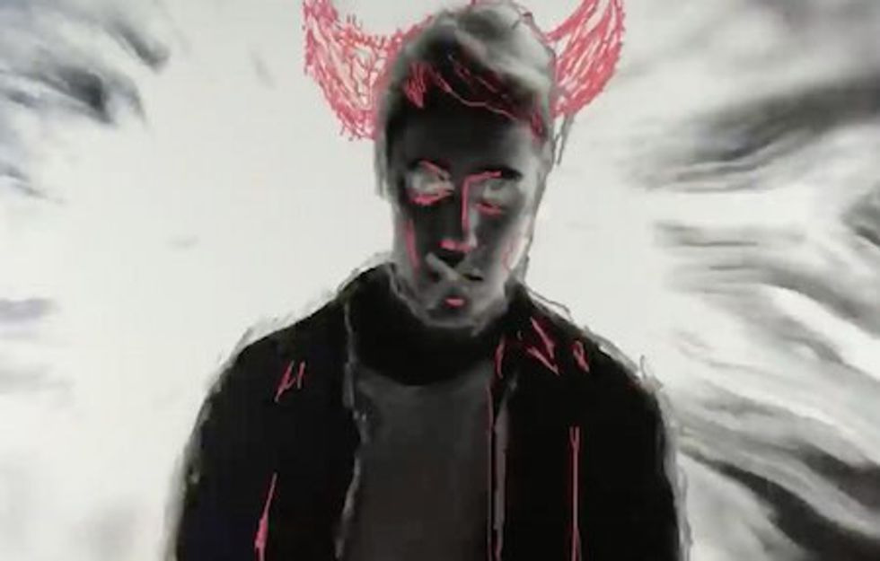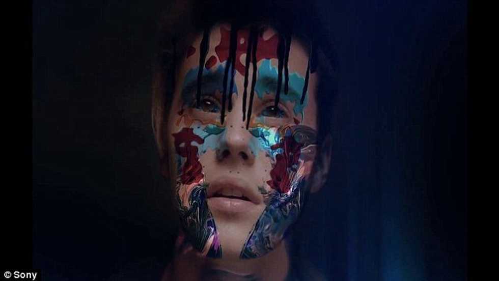 He's then splashed with electronic paint. The splashes and brushstrokes transform the lone pop star into a masterpiece.