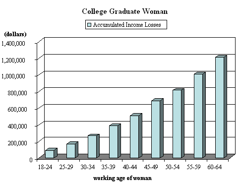 We all know what's going on now with equal pay. If you are a white woman in the United States, you are bound to make 79 cents for each dollar a man makes. That is just for white women — if you are Latino, Asian or Native American it is even lower. While that doesn't sound like a lot, if you are a high school grad and get a decent job, you will be losing $700,000. If you are a college grad, you will be losing $1,200,000, and if you are a professional graduate you will be losing $2,000,000 in your life time. So yes, even if you spent eight years in school to get your bachelor's, master's and Ph.D., you will still be losing money compared to your male counterparts.