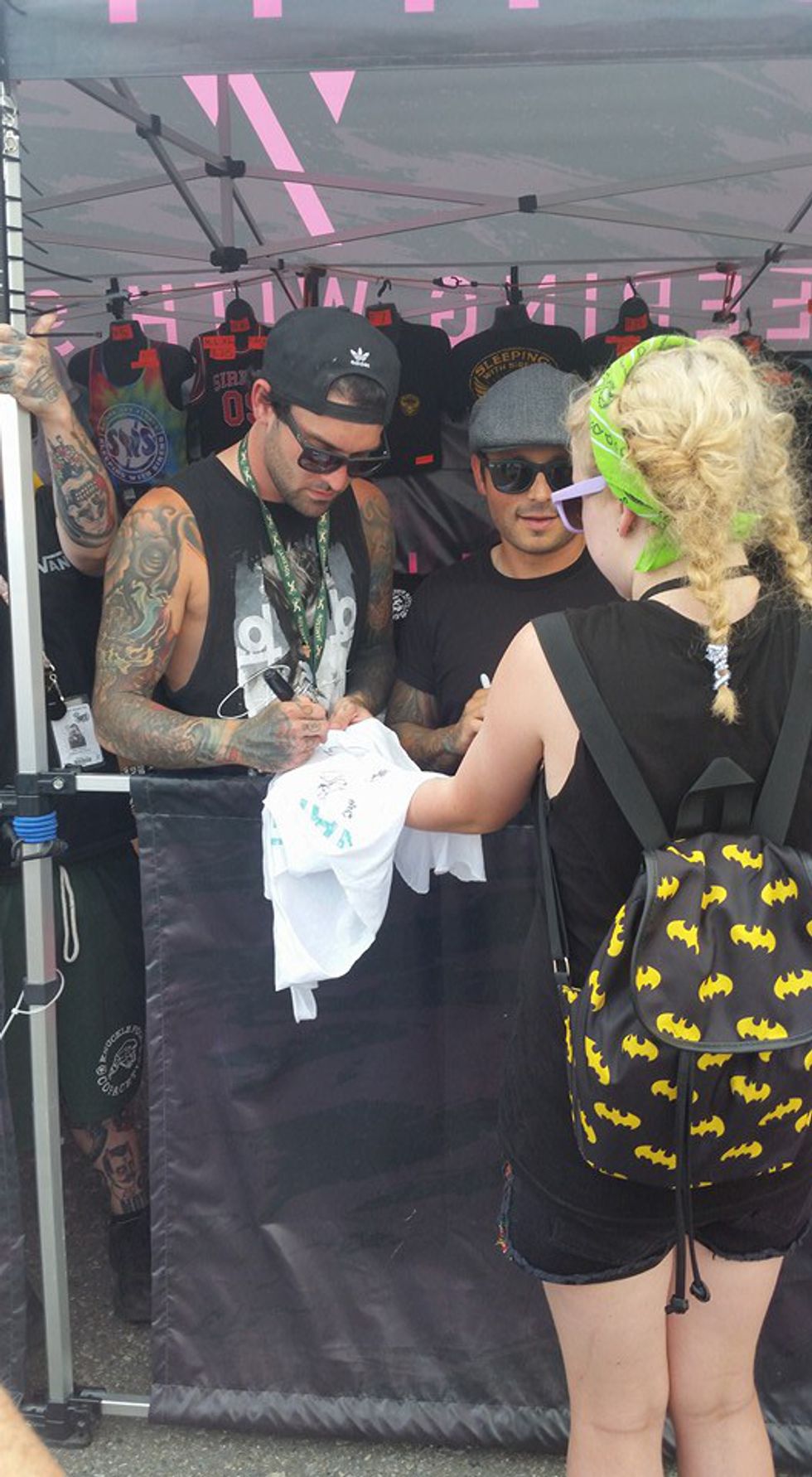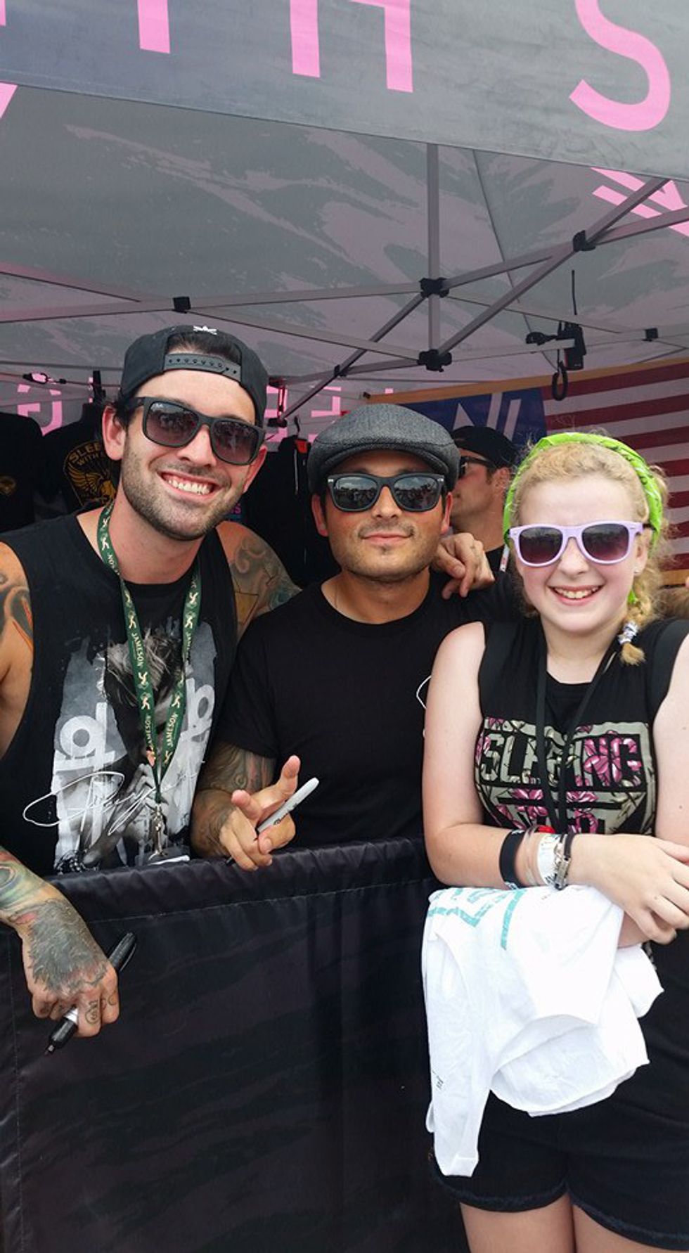 The cool thing about music festivals is that you can not only see a bunch of artists, but there is tons to do. While looking for specific tents, I noticed a line starting to form at the Sleeping With Sirens tent. Grabbing my family I told them we had to move. I had seen cuties with sunglasses on under that tent. Low and behold it was two of the lead guitarists, and my sister's face was incredible! She was so overwhelmed she just smiled so big, and I am so glad we caught them.