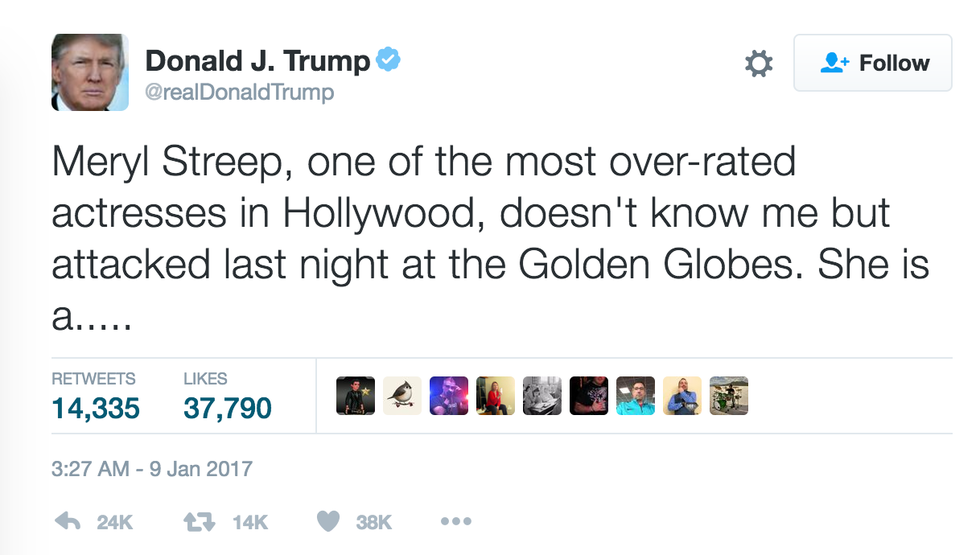 Meryl Streep took a leap of faith with this speech, and it hit home with a multitude of people. Not only did she illustrate such a portrait, but the reaction to it in itself just added another stroke. Donald Trump's reaction was not one that was a surprise, taking his business and plastering it on the social media website, Twitter.