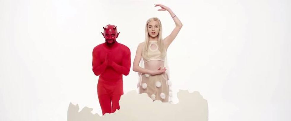 What does Lowlife, the song, have to do with the music video? It supports the idea of how we think pop artists get their start. Being told what to do and say (New day but the same lines, I feel like a victim of the dollar sign) by directors/agents. Making a deal with the devil because he can give the musicians a new start and fame. The "selling your soul to the devil for fame" idea is what we made up; it's our romanticization on fame. And Poppy definitely highlights this in Lowlife. We see her in specific poses that her directors placed her in. We see her standing by the devil in a hatched egg, implying that the devil is behind her birth (as an pop artist). We also see her dining with the devil, signing for fans, and trying a new inhalant drug: [what we think is] the every day life of a pop artist.