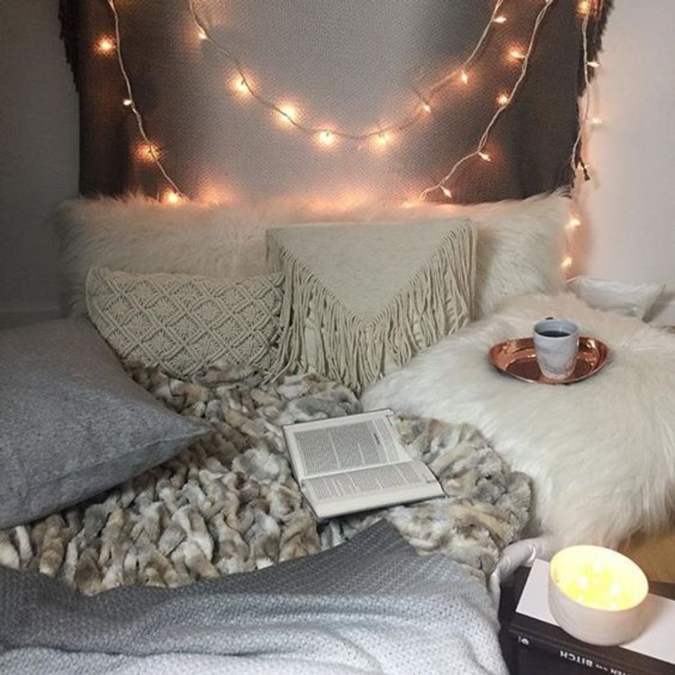 We've already talked about hygge lighting, now lets talk about decorating hygge. Everyone needs a "hyggekrog" which basically translates to "a nook". Create a cozy place to curl up with a blanket and just relax. Bring Nature inside. Go buy some flowers from your local store. Decorate with faux sheepskin to give your spac texture and an extra layer of coziness. You can't forget about books! Books are not only one of the most hygge things to do, but you can also study in your hyggekrog. Since hot drinks are a big part of hygge life, incorporate ceramics into your little spaces. And last but not least, blankets and cushions. Hygge is all about coziness after all. What could possibly be more cozy than crawling into your cushiony hyggekrog after a long day of classes with a fuzzy blanket, a warm cup of cocoa, and a good book? Of course, curling up to your favorite movie or t.v. show is always an option as well!