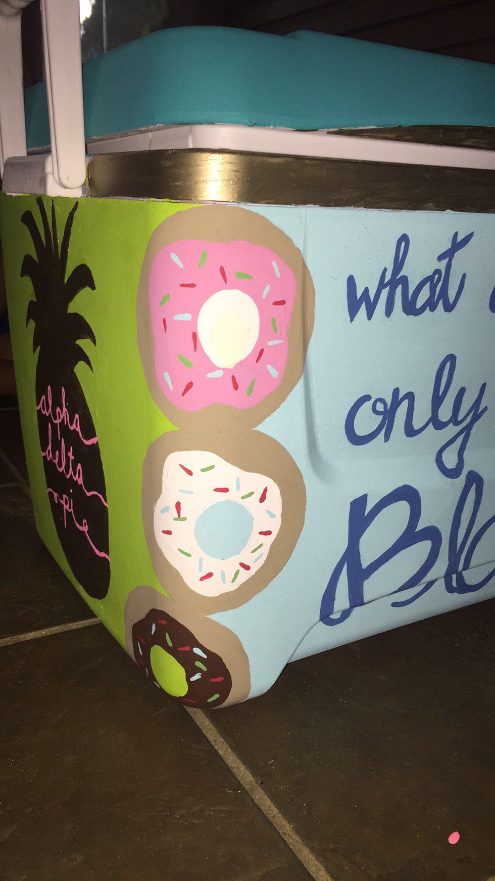 I loved searching the internet for inspiration for my cooler. I love how it basically describes me in so many aspects. From the "I carried a watermelon" quote from Dirty Dancing, to the doughnuts and my sorority letters on it. Check out my cooler and I hope you try out painting your own cooler soon!