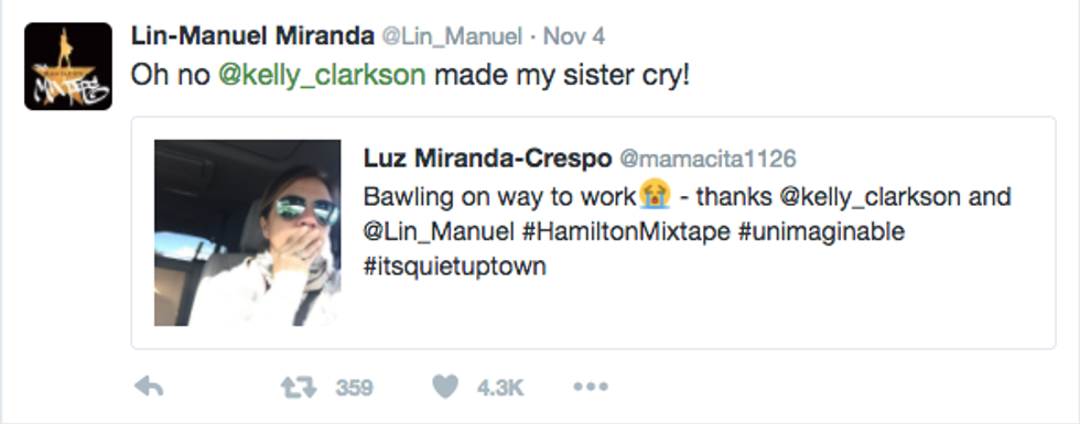 Kelly Clarkson's "It's Quiet Uptown" is just as gut-wrenching as the original. Once again, the song is performed in a less theatrical way, but the emotion behind the lyrics is still obviously present. Kelly Clarkson puts a new spin on such a key song in Hamilton, and it is absolutely brilliant. If you're needing a good cry, this song is definitely for you. However, don't take just my word for it. Kelly Clarkson's "It's Quiet Uptown" even made Lin-Manuel Miranda's sister cry when she listened to it!