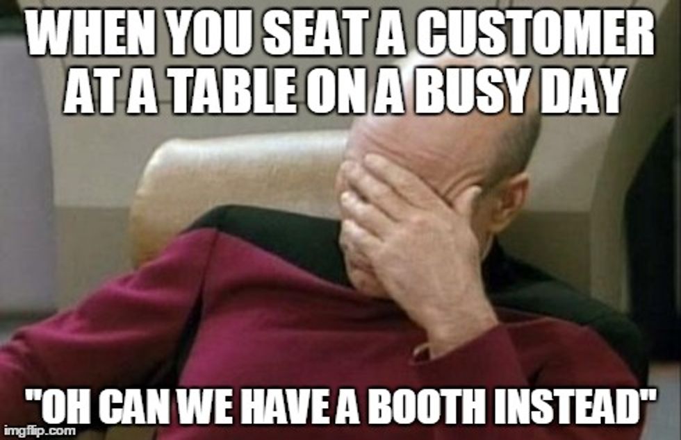 4. The host/hostess is not trying to purposefully upset you by saying there are no booths available. Once again, just because you see a booth does not mean it's available. There is a lovely thing called rotation in which hosts are required to seat you in a specific section for a specific server. Do not ask, "Oh can we have that table instead?" unless you're handicapped and really do need a specific seating assignment. Your food will taste exactly the same no matter where you sit.