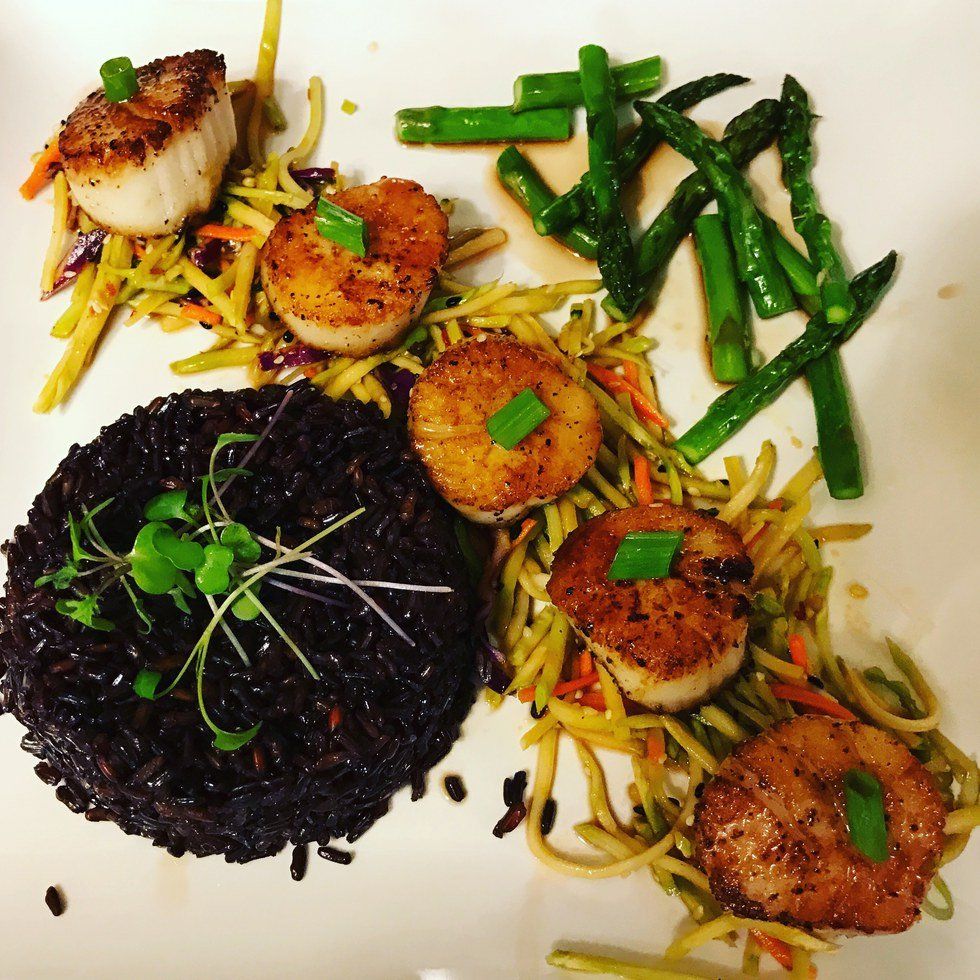 Use Your Components for Visual Flair – A great example of this can be seen in the photo accompanying this article. As you can see, the scallops have a great sear which gives them a beautiful golden brown color. This is contrasted by the white center of the scallops and then additionally by the broccoli slaw that helps to break up the white center of the scallops from the plate itself. Also not to be overlooked is the use of the kale microgreens on top of the bed of coconut black rice on the plate. The green and irregular shape of the microgreens allow them to pop against the dark colors of the rice. You might also notice that I took the time to use a ramekin to shape the rice into a highly symmetrical circle which plays against the squareness of the plate itself.