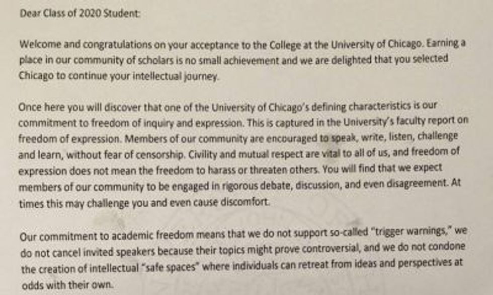 The University of Chicago’s Dean of Students, John Ellison P.h.D, recently wrote a letter to all incoming freshman stating that the University will no longer support “trigger warnings” or “safe spaces” in the coming years and it has caused an all out war on the internet. A “Safe Space” is, “a place where anyone can relax and be able to fully express, without fear of being made to feel uncomfortable, unwelcome, or unsafe on account of biological sex, race/ethnicity, sexual orientation, gender identity or expression, cultural background, religious affiliation, age, or physical or mental ability.” Though the idea of a safe space is great; I mean who wouldn’t want a place where everyone is accepted and happy, but let's be real it is wildly and entirely unrealistic. College is an institution to prepare young adults for the real world they will soon be entering and you're dreaming if you think there are “safe spaces” and “trigger warnings” out there.
