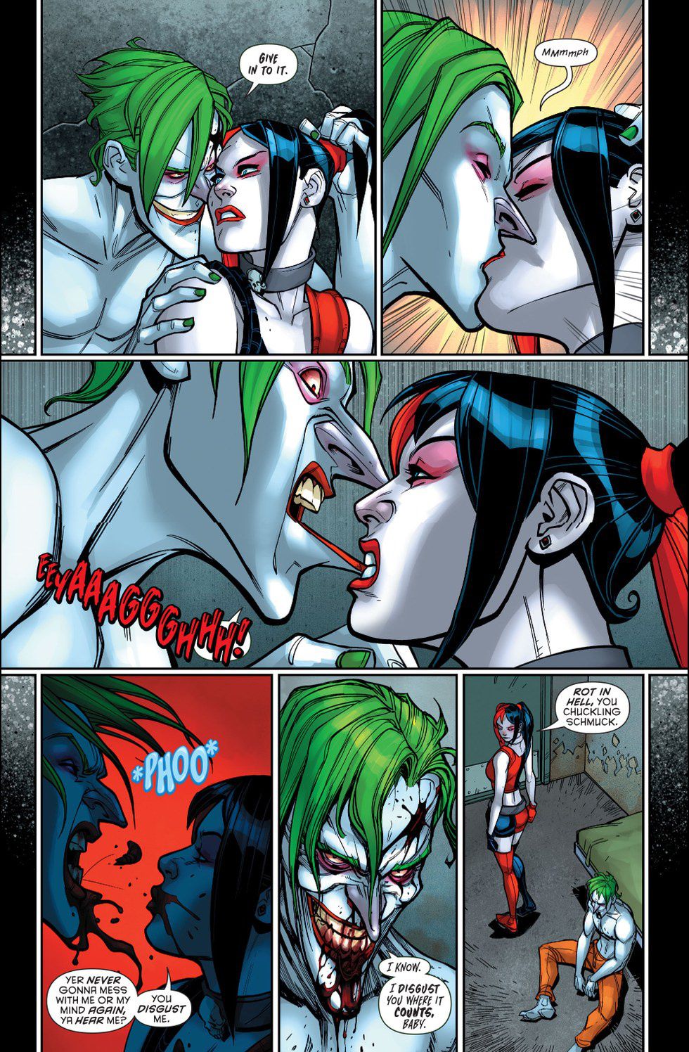 It is sad that The New 52 version of DC has decided to fall into the grasps of the masses and has tossed this idea that The Joker and Harley have a strange obsession for each other. With amazing art, they disappoint in character development and actual story. In a comic released back in February (Harley Quinn, Volume 2, Issue 25), they had Harley go into where Joker was being held and yell at him for being "abusive" toward her.