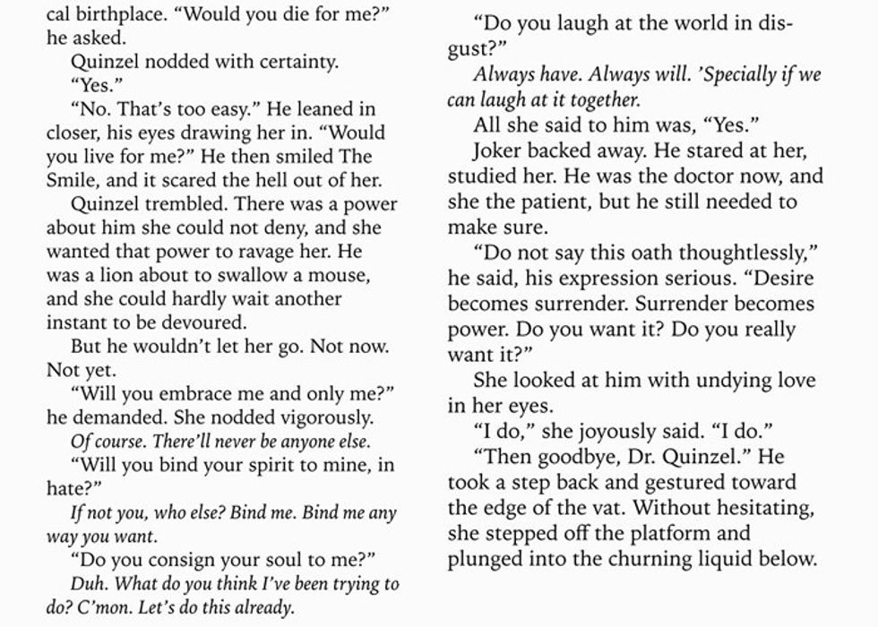 This isn't want formed from anything like abuse or Stockholm Syndrome, this is something that Harleen decided even before she became Harley Quinn. In the text there's nothing about him pushing her in, nothing about her doing it because she doesn't want to be with him. She does it because she wants to be reborn just like him in the same chemical where he was born. She wants to be like him, she wants to be more than him. Just because he hits her, just because there are some comics where he holds her by her throat does not mean he's abusing her, not if that's what she wants, what she signed up for.