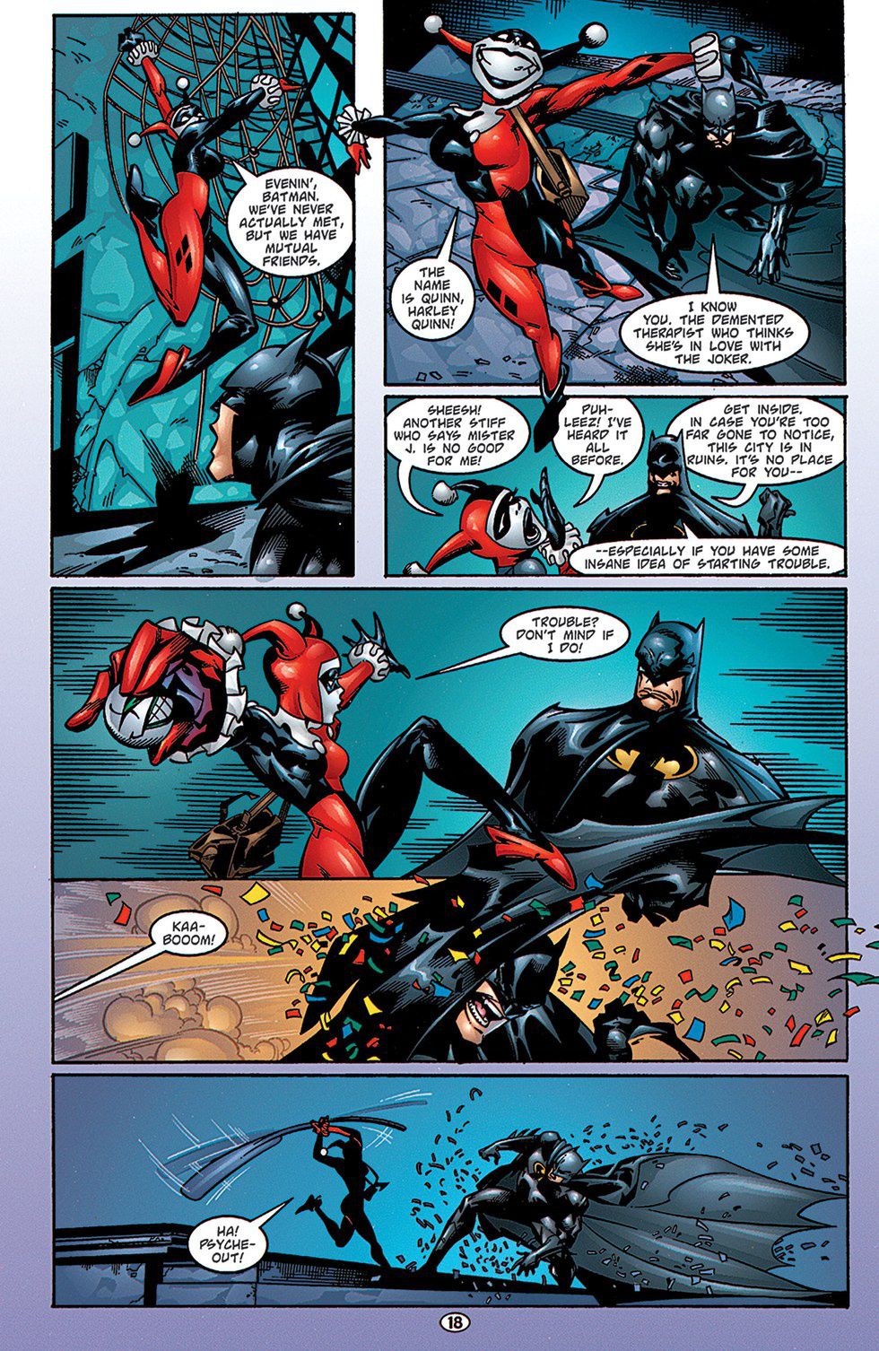 I think maybe the best comic reference I can provide is then these two pages from Batman: Harley Quinn. In this comic, Harley Quinn's starting has little to do with The Joker at all other than the fact that she does fall in love with him. This time, she just lets him go and then the people at Arkham check her in. Then, later, she finds Joker after getting released from the asylum by accident dressed as Harley Quinn and she immediately starts doing things for him and they even begin a romantic relationship. Though he never asks her to and never coerces her and never even touches her.