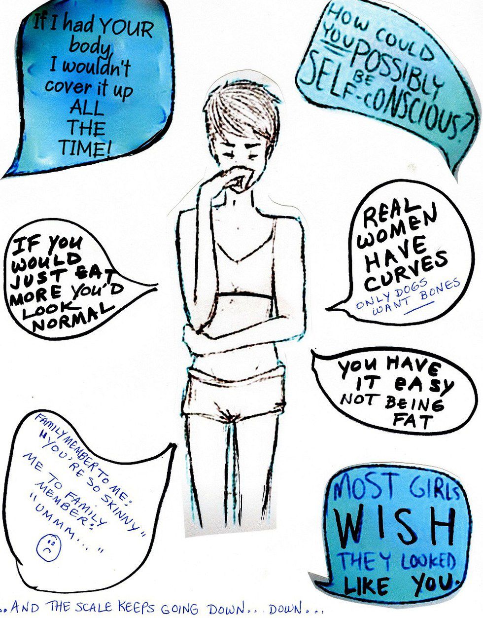 Aside from being questioned by adults, girls my age made nasty comments to me. When I would talk to my friends about my body, they would always shut me down. Girls who had healthy bodies would constantly tell me “Well, you wouldn’t understand. You’re skinny.” People had this idea that just because I was skinny meant that I didn’t have any problems at all. They thought that because I wasn’t overweight, I didn’t have boy problems, friend problems or school problems.