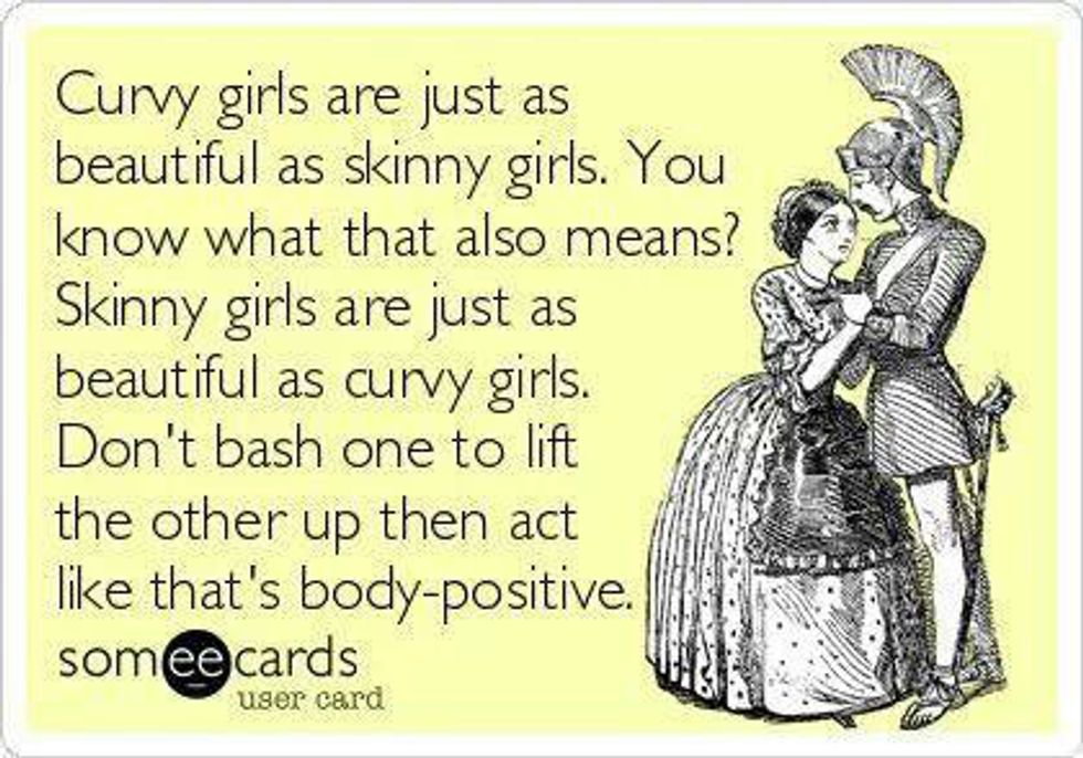This is not an article trashing overweight and/or non-skinny girls. I thoroughly believe that all body types are beautiful and should be embraced. The world also has this view, and always tries to validate that all people are beautiful. However, sometimes people go about it the wrong way. For example, listening to Meghan Trainor and Nicki Minaj constantly call me a “skinny b*tch” on the radio was not fun. Or logging onto Facebook and reading that “real women have curves.” Was I not a “real” woman because my body didn’t curve? Another popular one was that “real men like meat; only dogs like bones.” Here’s a friendly reminder that telling girls that men won’t like them if they’re not this way or that way is not the proper way to build up confidence from within.