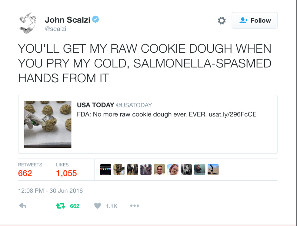The idea that I will stop eating raw cookie dough because the FDA tells me to is literally laughable. I actually laughed out loud when I saw the topic was trending on Twitter. Some of my fellow birdies agree with me.