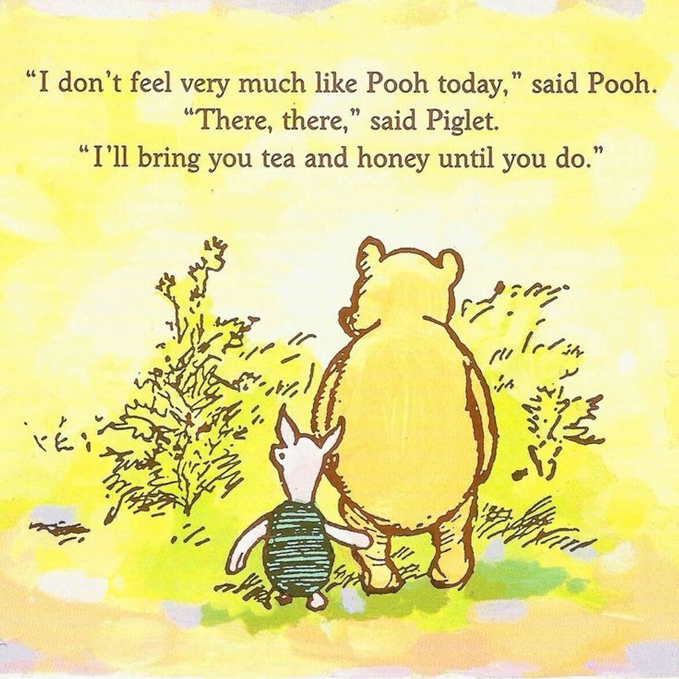 "What I like best in the whole world is Me and Piglet going to see You, and You saying 'What about a little something?' and Me saying, 'Well, I shouldn't mind a little something, should you, Piglet,' and it being a hummy sort of day outside, and birds singing."
