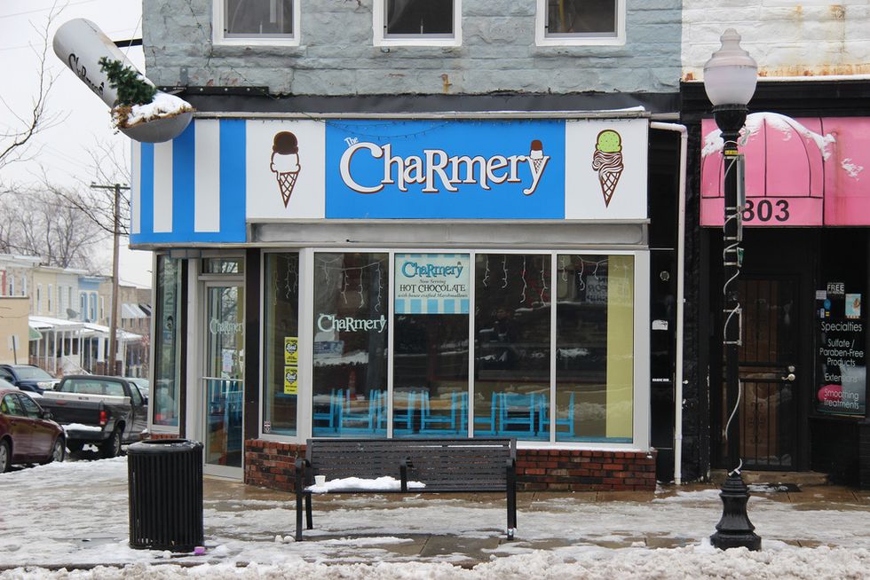 The Charmery is a cafe located in Baltimore. They are known for their handcrafted ice cream and rich hot chocolate. They are the place to go in the hot and the cold!