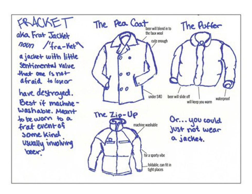 9. That being said, make sure you have a Fracket (frat+jacket) a term born on college campuses to describe a crap coat you wear to parties that you aren't attached to.