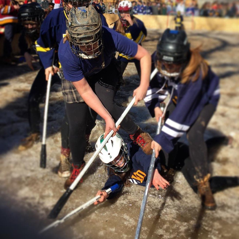 Coupled with the game-day excitement that followed bringing all of Greek life together, this event was also amplified, and complicated, this year by a record high of 61 degrees. While this really helps to make people happy and keep spectators comfortable, it really doesn’t help in terms of keeping ice cold. The day got increasingly interesting as more and more of the ice rink melted. This resulted in players having to run through, at times, as much as six inches of water. However, this did not nothing to dampen (pardon the pun) enthusiasm and the crowd remained until almost 7:00 p.m.
