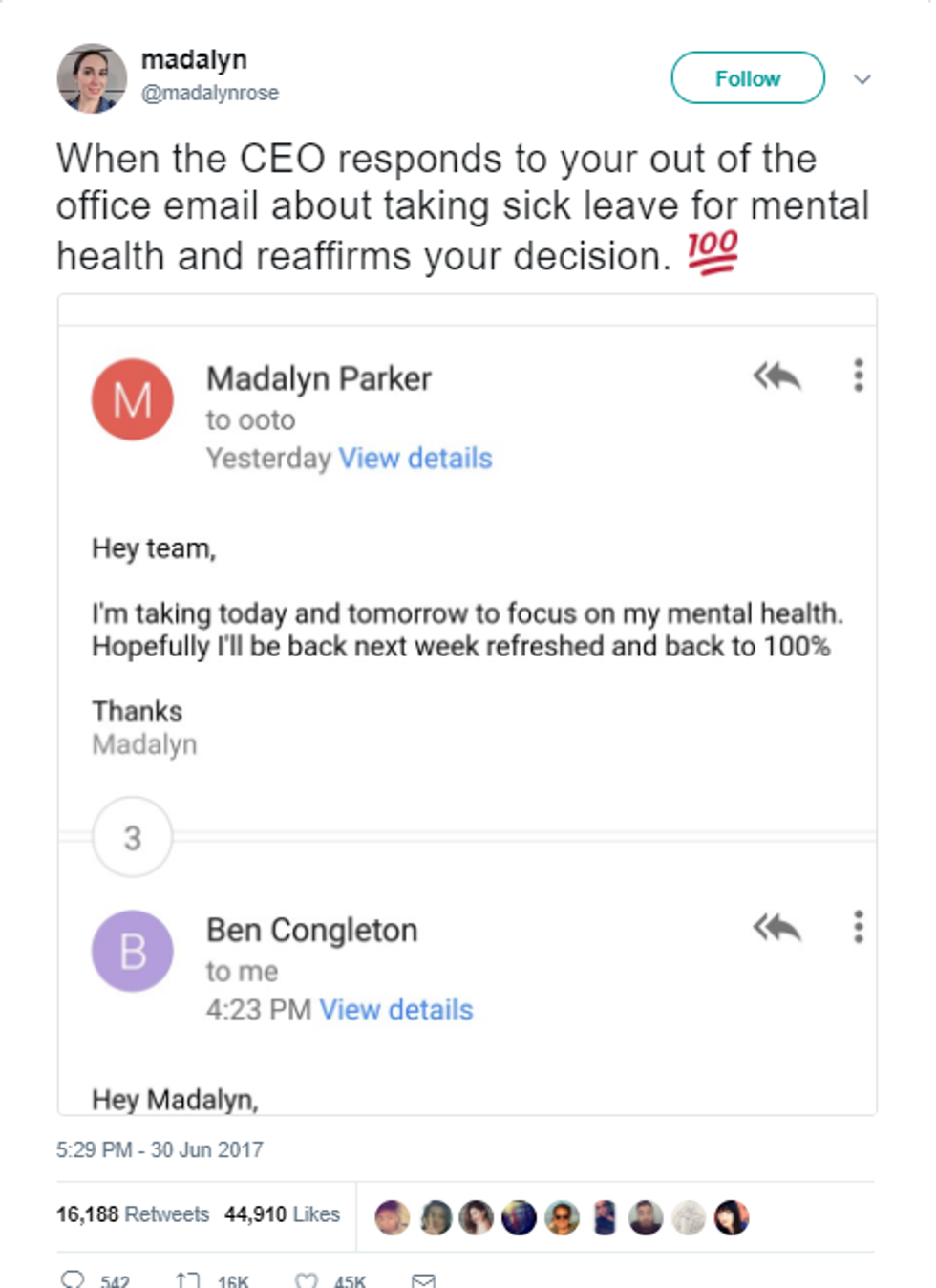 A woman's viral tweet is sweeping the net. Madalyn Parker, also known as @madalynrose, advocates the importance of ending the stigma of mental illness. Her voice is finally definitely being heard now that the world knows about her email exchange with her boss, wherein she requested time off to tend to her mental health.