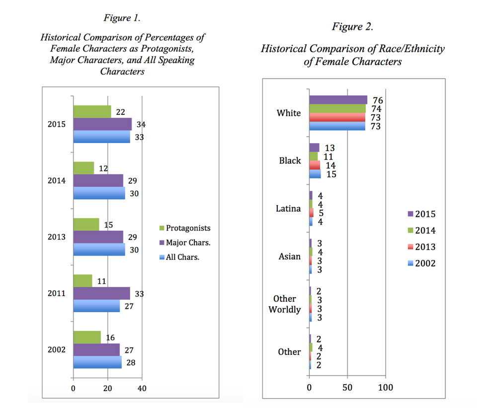 In 2015, a study found that out of the top 100 domestic grossing films, only 34% of characters with major roles were women, and that only about one-third of all speaking characters were women as well. When examining protagonists in these films, the study also found that only 22 percent of those were women. Let's also not forget that the roles for women of color are even smaller, with only 13% being black women, 4% being Latina women, only 3% being Asian women, and only 4% being "otherworldly" and "other" in 2015.
