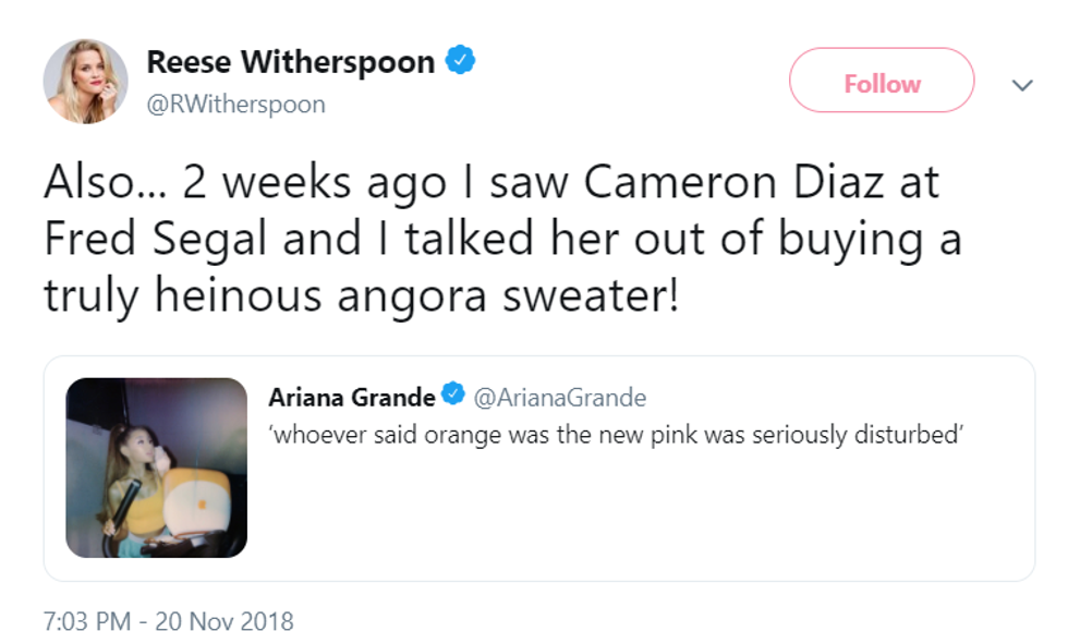 Ariana Grande replied thanking Reese Witherspoon for playing such a "brilliant" and "necessary" female role. Witherspoon even featured Grande on her story covered in hearts.