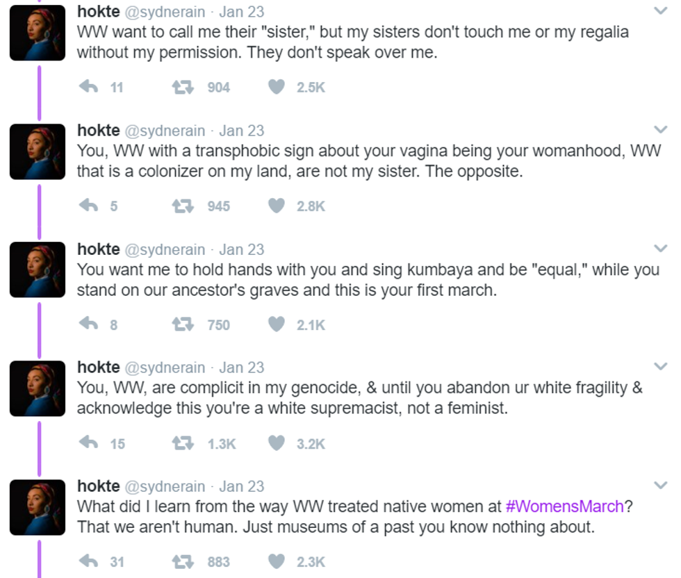 A look at the event’s Facebook page comments and other social media traffic associated with the rally indicates a large number of attendees who felt that the program was able to foster empowerment and unity; however, a highly overlooked but certainly still crucial voice that also appeared in response to the march was dissatisfaction with the ‘whitewashed’ demographic of the rally, the centering of the rally on cisgender women and cissexist standards, and the inclusion of nationalistic and patriotic elements to the program.